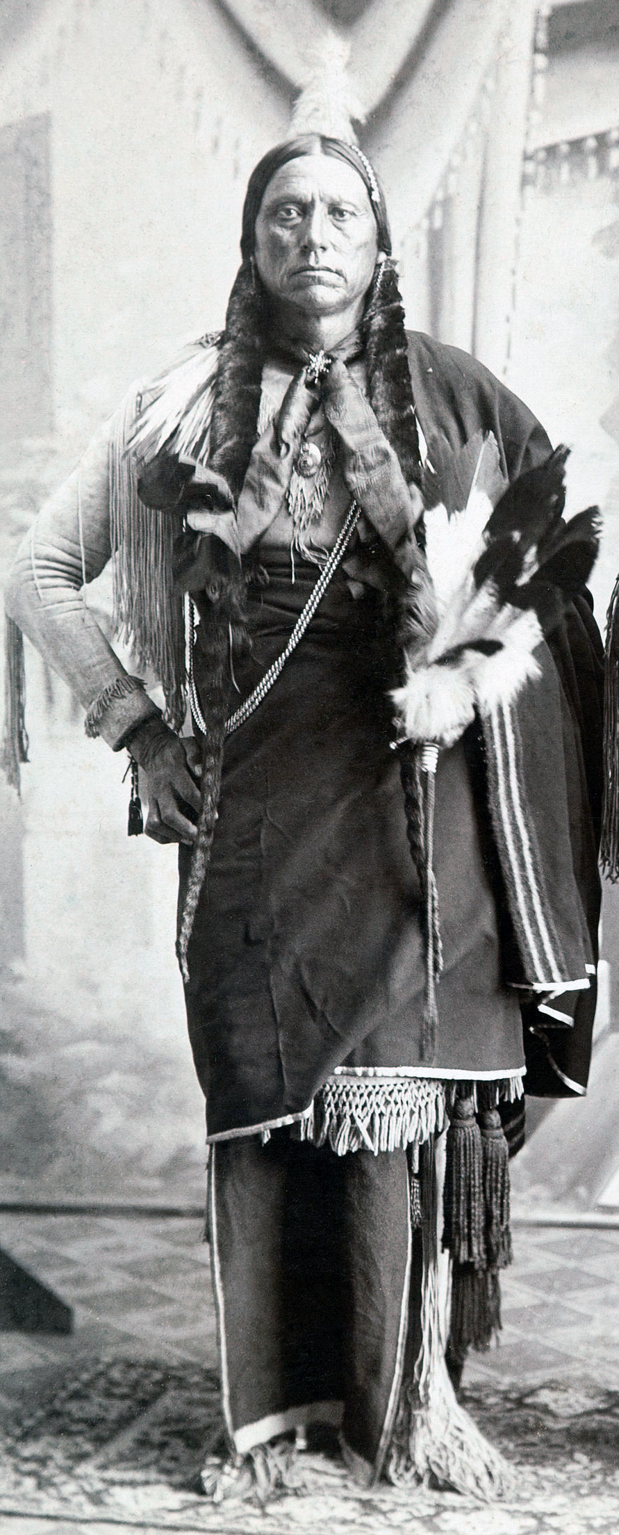 Quanah Parker, born in 1845, was a prominent traditional leader and chief of the Comanche Nation, known for his role as a war leader of the Kwahadi band. He was the son of Peta Nocona, a Kwahadi chief, and Cynthia Ann Parker, an Anglo-American woman who had been abducted during the Fort Parker massacre in 1836. Growing up among the Kwahadi, Quanah became a significant figure in the Red River War, where he clashed with Colonel Ranald S. Mackenzie following the apprehension of several Kiowa chiefs in 1871.